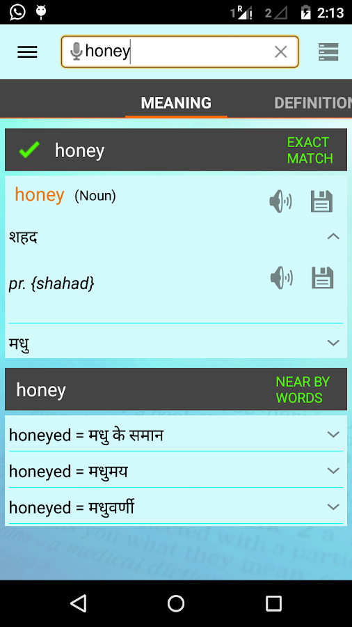 This app can help in learning both Hindi and English language. Words are provided with proper grammar usage like Noun, Verb, Adjectives, Pronouns etc. Many idioms are explained via examples. Difficult words are explained with examples and detailed definition. Daily word learning help in building vocabulary for language. Synonym of words help in knowing similar words and antonym of words help in knowing opposite meanings. Spell checker can help in avoiding common mistakes. One can track search history and mark words as favourite.